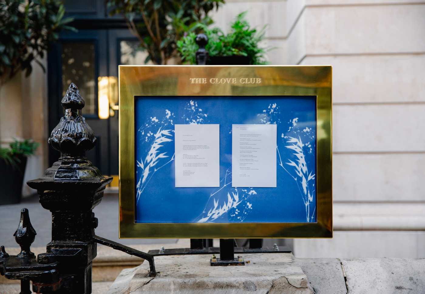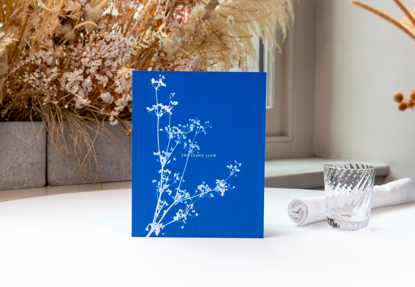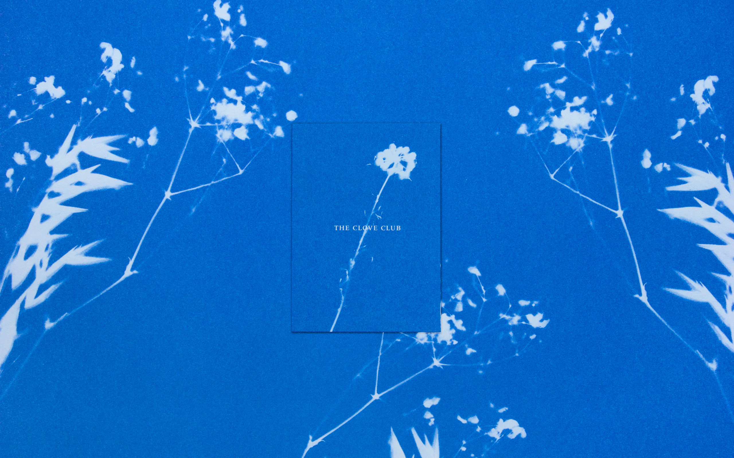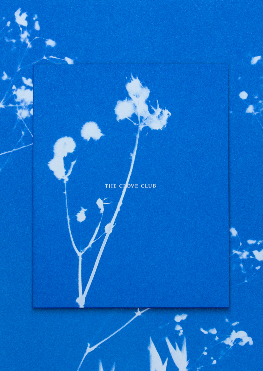 Imbuing the identity with a sense of craft and striking beauty, we used an old-fashioned, analogue photographic processing technique, creating a set of cyanotypes, each comprising botanical imagery that speak of nature rather than overtly of food. The vivid Yves Klein-like blue creates a complimentary accent to the space whilst delivering a striking sense of identity to the table, one that weaves its way in and out of the guest experience from arrival to departure.